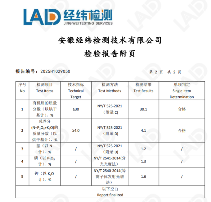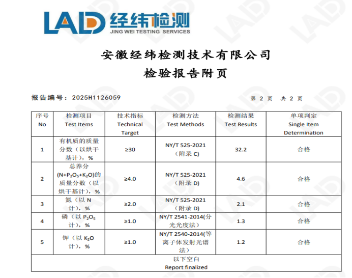 2.固鎮(zhèn)縣華地農(nóng)牧有限公司生產(chǎn)的有機肥,規(guī)格為N+P2O5+K2O≥4.0%,有機質(zhì)≥30%,抽檢基數(shù)為2噸,送安徽經(jīng)緯檢測技術(shù)有限公司檢測,結(jié)果為合格。