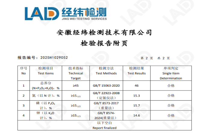 1.安徽徽普生物科技有限公司生產(chǎn)的復(fù)合肥,規(guī)格為N+P2O5+K2O≥45% (15-15-15 含氯),抽樣基數(shù)為2噸,送安徽經(jīng)緯檢測技術(shù)有限公司檢測,結(jié)果為合格。