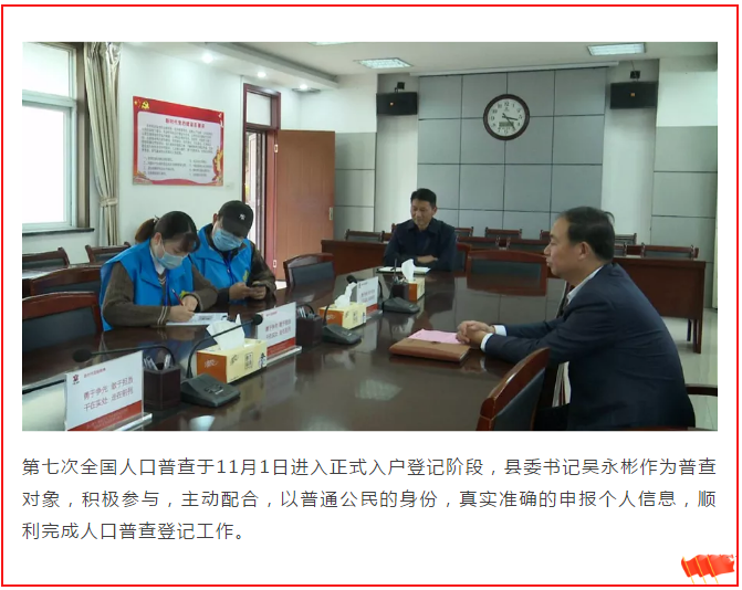 11月2日下午3時(shí)許,吳永彬在縣委常委會(huì)議室熱情接待了城關(guān)鎮(zhèn)社區(qū)人口普查員,以一名普通公民的身份參加登記。登記過程中,吳永彬詳細(xì)回答了普查員的詢問,在核實(shí)登記信息后,鄭重在手持移動(dòng)終端上簽名確認(rèn)。登記結(jié)束后,吳永彬關(guān)切詢問普查員工作情況及遇到的問題,并就做好全縣人口普查工作提出了具體要求。