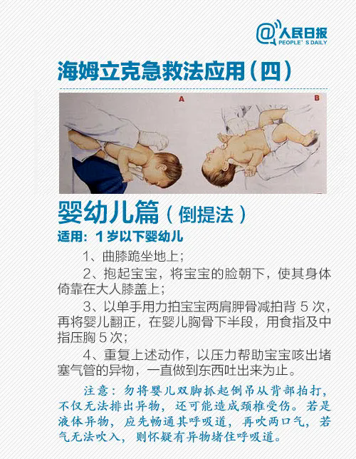 一只手固定嬰兒頭部將其背部朝下,保持頭低腳高,用另一只手掌根連續(xù)叩擊肩胛骨連線中點(diǎn)5次,然后將嬰兒反轉(zhuǎn)成面部朝上,保持頭低腳高,立即用食指和中指按壓兩乳頭連線中點(diǎn)5次,兩個(gè)步驟反復(fù)交替操作。