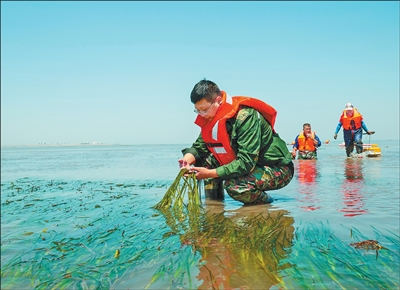 曹妃甸海草床修復(fù)項(xiàng)目技術(shù)人員在查看海草生長(zhǎng)情況。