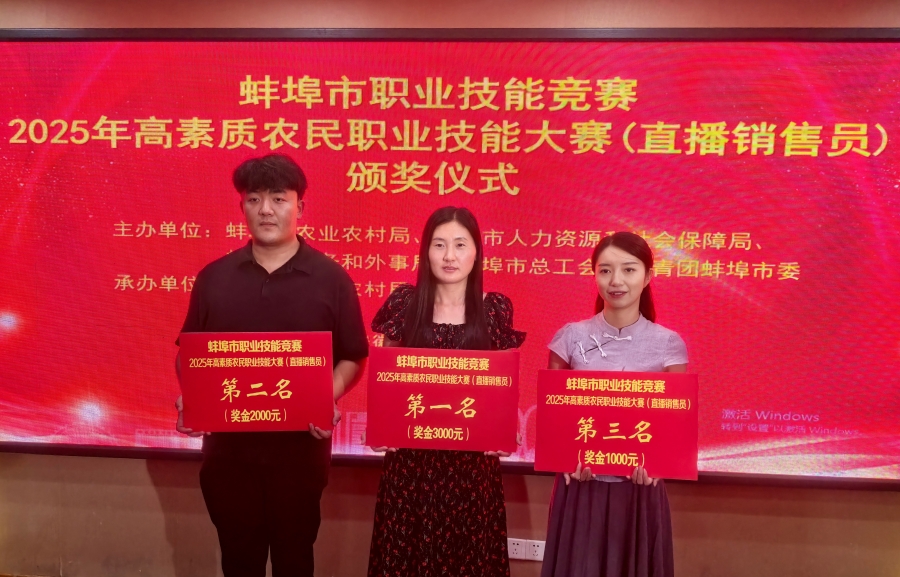 8月21日,蚌埠市職業(yè)技能競賽-2025年高素質(zhì)農(nóng)民職業(yè)技能大賽(直播銷售員)在五河縣圓滿收官,固鎮(zhèn)縣選手徐研榮獲第一名。